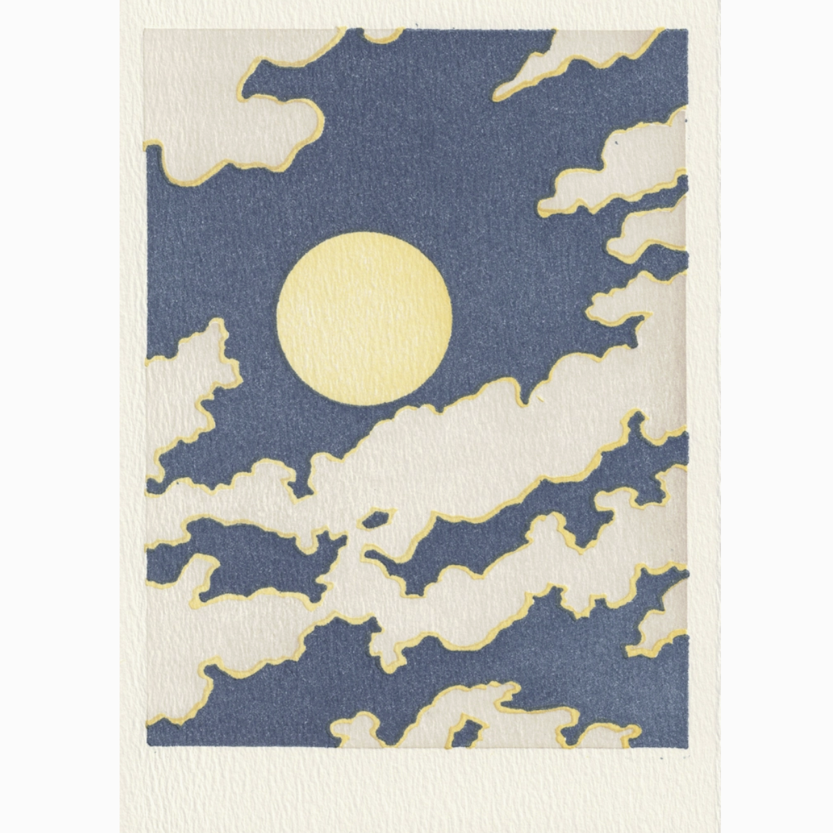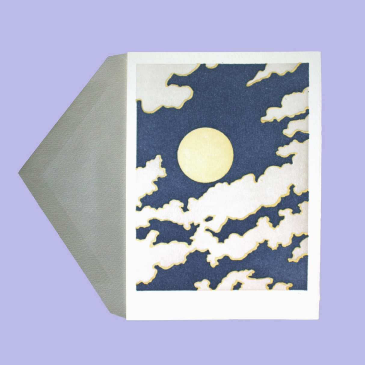 A serene sky captured in paper form - this beautifully designed card features a full moon glowing softly behind drifting clouds.